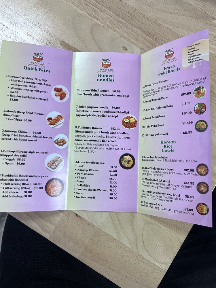Catering to a variety of tastes, the menu features options from spicy ramens to refreshing poke bowls and boba teas. The staff is welcoming and attentive, ensuring a memorable dining experience. Whether you're a Korean cuisine aficionado or trying it for the first time, Food Lab is the perfect place to explore new flavors!